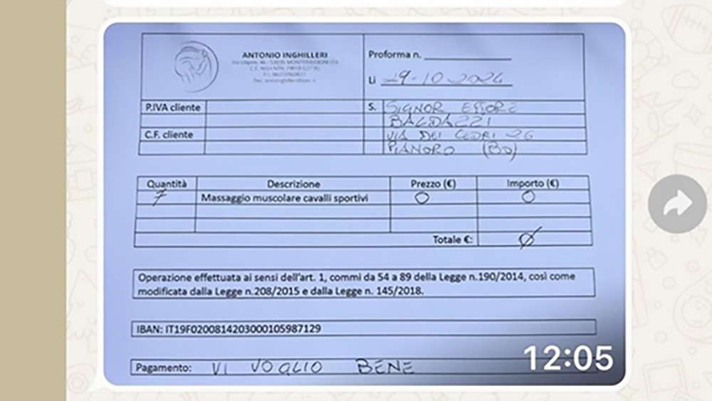 A meno che ci si senta intorno tutto il supporto degli amici, come nel caso di Antonio Inghilleri, professione massofisioterapista equino, l’ignaro (non poteva certo sapere che l’avremmo attenzionata…) autore di questa magnifica fattura proforma.