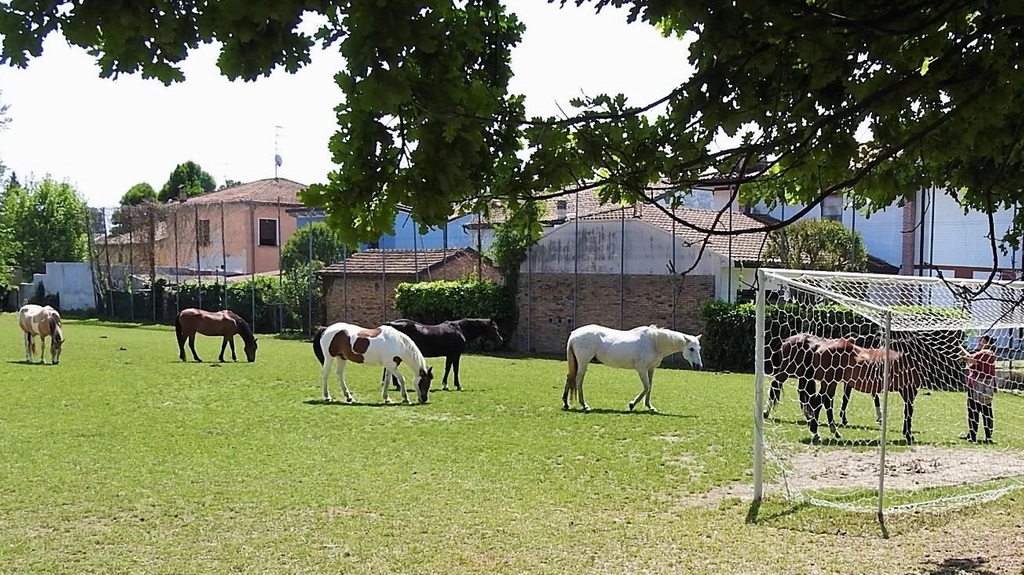 “La mattina del 19 maggio – racconta Elisa – l’acqua nell’ampia area dedicata al pascolo aveva già raggiunto il mezzo metro di altezza. Inizialmente non ci siamo fatti prendere dal panico ma in serata, visto che il livello continuava a salire, abbiamo deciso di trasportare i cavalli altrove. Tra i vari siti ritenuti idonei a ospitarli, abbiamo pensato al campetto da calcio parrocchiale nei pressi della chiesa di Voltana. Grazie alla disponibilità di don Maurizio abbiamo così allestito in fretta e furia una sorta di task-force e in tarda serata, con il prezioso aiuto di volontari, abbiamo condotto i nove cavalli nel campetto da calcio a circa tre chilometri da Chiesanuova”.