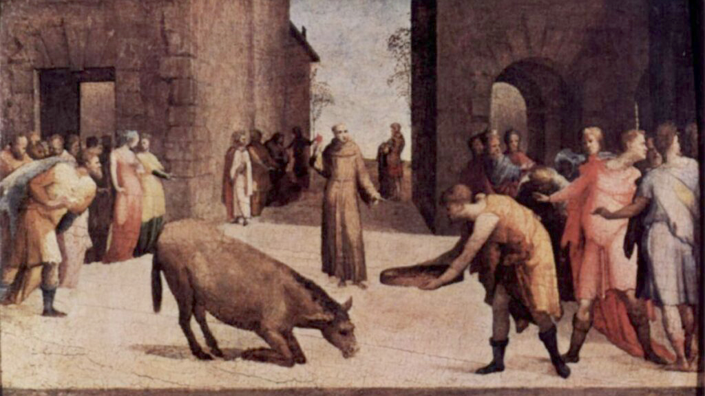 Ma l’asino “che si inginocchia” più famoso della tradizione italiana è sicuramente quello del miracolo di Sant’Antonio da Padova (Liber Miraculorum): si tratta di una narrazione popolare molto nota, in cui un asino si inginocchia davanti all’Ostia consacrata.