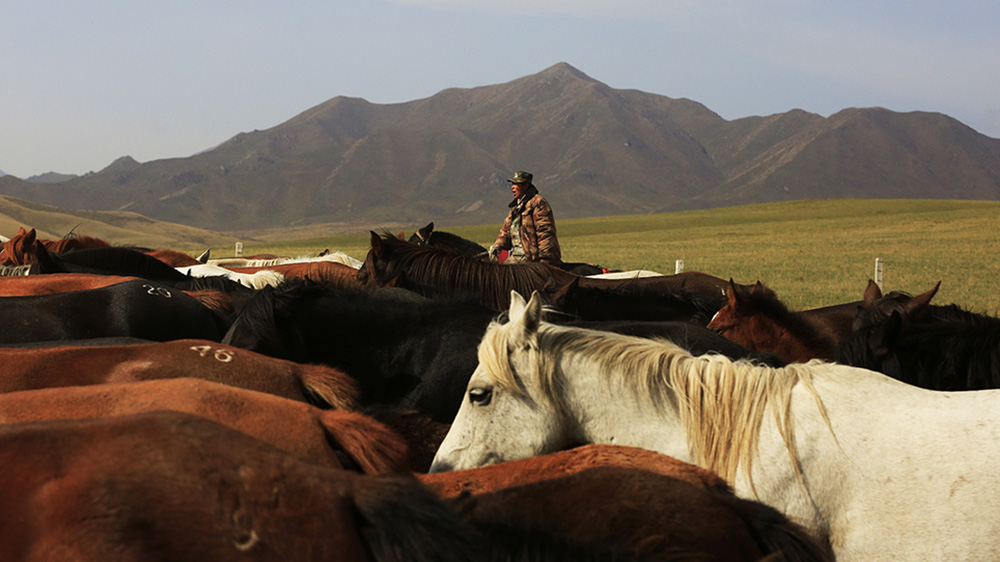 Al confine con la Mongolia Interna, un cavallo sta pascolando nello sterminato paddock dell’Allevamento di cavalli a Shandan. A settembre, l’erba della prateria di Shandan inizia a trasformarsi gradualmente da verde a giallo. I cavalli, robusti e ben alimentati, vengono spinti dai pastori – come in una transumanza d’altri tempi – ad abbeverarsi in riva al fiume o a pascolare nelle praterie.