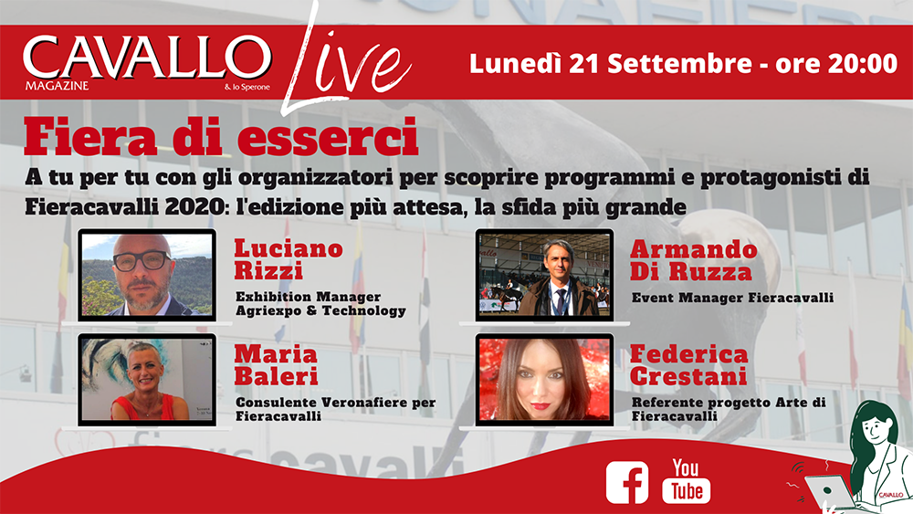 Bologna, 18 settembre 2020 – Grande appuntamento con il mondo equestre per lunedì 21 alle ore 20. Cercheremo di approfondire un argomento che sta a cuore a tutti e, con l’approssimarsi delle date di calendario, si ripropone con frequenza: come sarà FieraCavalli di quest’anno? Ovvero, come il Covid influirà sullo svolgimento di un evento che, per sua natura, è esattamente l’opposto del distanziamento? E poi, ancora, in virtù delle tante cancellazioni dei principali eventi sportivi nel mondo, ci sarà la Coppa?