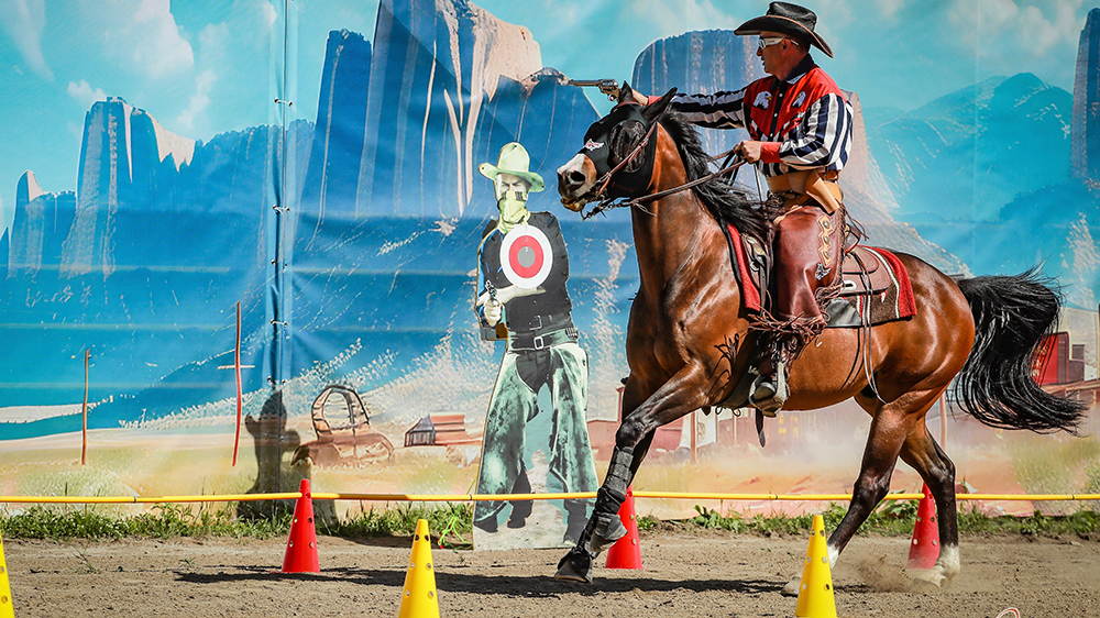 I bersagli sono disegnati su sagome alte un metro e novanta che rappresentano coloriti personaggi, i fuorilegge del vecchio West, e anche tutto lo sfondo dell’area di tiro e la scenografia del campo gara rappresentano divertenti paesaggi da film western. Ma al di là dell’affascinante contorno, la gara richiede vere competenze sia a cavallo sia con la Colt: sì, perché è proprio una riproduzione del mitico revolver dei cowboy, dei cacciatori di taglie e dei banditi del Vecchio West l’unica “arma” consentita in questa gara. Per essere precisi, la Colt Peacemaker del 1873.