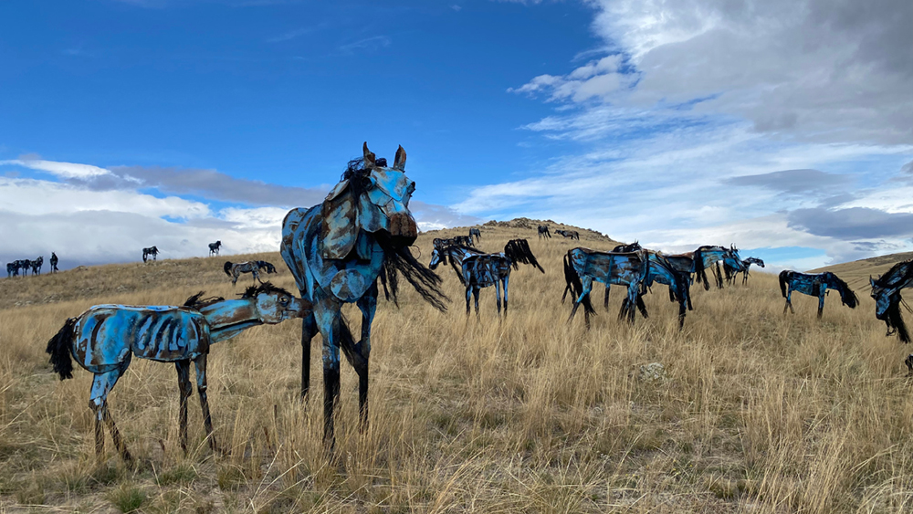 A vederli da lontano sembrano seguirti con lo sguardo. E in prospettiva, la loro dimensione è perfettamente congrua con quella dei cavalli che si vedono abitualmente tra gli steccati dei ranch. Eppure i Bleu Horses sono una istallazione in metallo, liberi sulla proprietà di 160 acri di Dean Folkvord che li ospita.