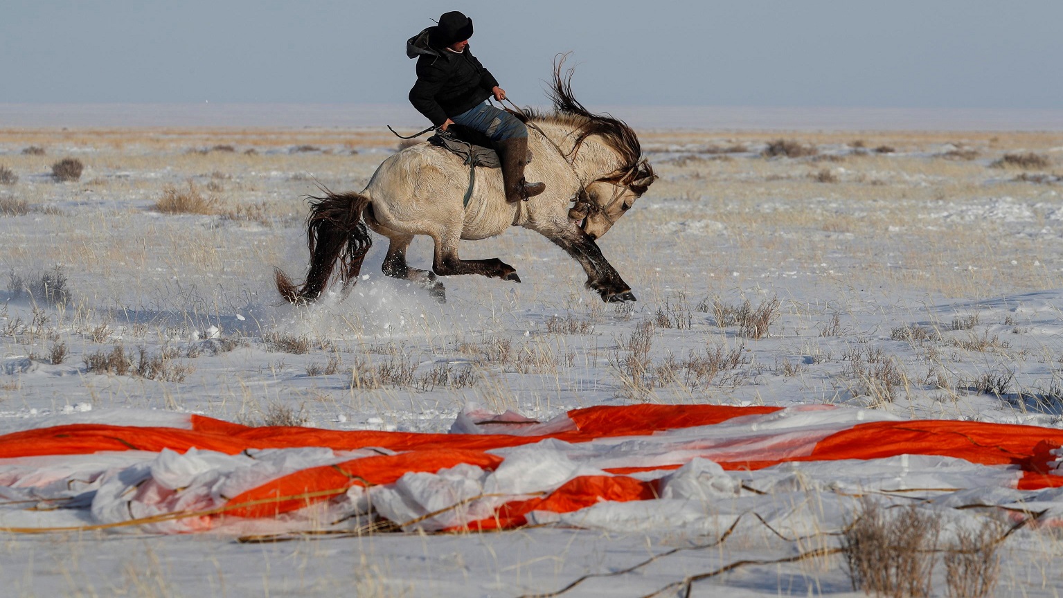 Astana, 7 febbraio 2020 – La neve, la steppa e un cavallo grigio che sgroppa con entusiasmo: probabilmente è un po’ sorpreso dal paracadute a strisce bianche e rosse che si allunga vicino ai suoi piedi, oltre che rallegrato dalla giornata di sole freddissimo che si intuisce dalla foto.