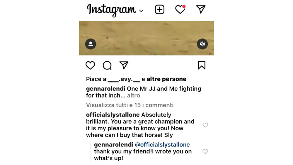 Il mittente è officialslystallone, un ‘vecchio amico’ di Gennaro. La taduzione va grosso modo così: «Assolutamente brillante. Sei un grande campione ed è per me un piacere conoscerti! Adesso, mi dici dove posso comprare quel cavallo?» Firmato Sly